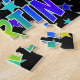 This lively and fun birthday-themed jigsaw puzzle design has the message "HAPPY BIRTHDAY, MARTIN" with the characters having a colourful rainbow spectrum inspired gradient pattern, along with a vibrant star shapes background pattern. A colourful puzzle like this might be used to send a birthday greeting message to somebody named Martin. [~Z0000468]