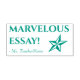 This inspiring rubber stamp design features the praise message "MARVELOUS ESSAY!" and a personalised educator's name. It also features a decorative star shape. It could be used by a teacher, educator, or tutor when marking assignments, to indicate that a student has done well.