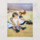 Mary Cassatt Children Playing on the Beach postcard. Oil painting on canvas from 1884. American artist Mary Cassatt was a great woman painter and impressionist. Children Playing on the Beach depicts two cute little girls playing in the sand on the beach with sailboats sailing on the water in the background. Both girls wear cute play dresses and black shoes. One little girl holds a shovel and bucked while the other wears a little sun hat with red ribbon. A cute gift for fans of Mary Cassatt, beach paintings, impressionism, and summer art.