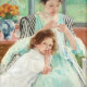 Mary Cassatt's "Young Mother Sewing" is a tender and intimate depiction of a mother sewing while her child looks on, showcasing the artist's talent in portraying the bond between a mother and child with a soft and warm palette.