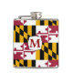 This flask features the distinctive gold, black, red and white pattern Maryland State Flag as it's background. The front carries your customised monogram in red on a white banner lined with a thin black border. Show your Maryland state pride with this handsome flask!