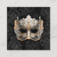 A highly detailed Venetian mask features elegant white and gold ornate designs with pearls and gemstones, set against a dark, damask-patterned background. The intricate craftsmanship and luxurious elements exude a sense of mystery and sophistication.