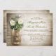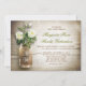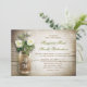 beautiful rustic wedding invitations with distressed wood background and mason jar with white flowers . I suggest a beautiful linen texture paper for this design.
