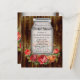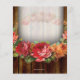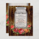 Bridal shower design with Mason jar and wreath shaped array of colourful roses and flowers, on a dark brown vintage wood plank background image. A rustic summer outdoor theme for a country or cabin theme bridal shower. Rich dark brown wooden boards from an antique fence or floorboards contrast against beautiful pretty floral graphic. © CustomInvitesOnline.com