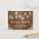 COUNTRY CHIC SAVE THE DATE POSTCARD | Rustic barn wood background, string twinkle mason jar lights, a babys breath floral corner decor, a tag tied with a knot featuring your initials and a simple wedding save the date template.