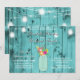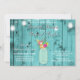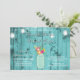 Trendy, turquoise wood and mason jar lights couples shower invitations for rustic country wedding styles- Vintage, stained turquoise wood planks background that resembles faded beach wood boards. Across the top are hanging, rustic country mason jars and romantic string lights. Personalised with couple's names in palest grey with shadow effect. A country chic mint green mason jar with wildflowers separates the wedding details. Back has matching aqua rustic wood background with country lanterns. Note: All images are printed. Use the Customise It button to change anything - font styles, sizes, colours, or placement. Perfect rustic country couples shower engagement party invites for vintage wedding themes, beach weddings, mason jar weddings, barn wedding styles, rustic weddings, country weddings, summer wedding, casual outdoor weddings, or country western weddings. We have coordinating, rustic wood wedding supplies and decor in our Zazzle.com/angela65 shop. Simple, country rustic engagement shower invites ready to be personalised with your own details.