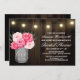 Mason Jar + Peony Rustic Bridal Shower Invitations - design features a barn wood background with string lights at the top with a bouquet of peonies inside a mason jar with the word love printed in an elegant font.