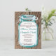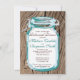 Rustic Country Mason Jar Rehearsal Dinner Invitations with a teal blue accent mason jar design on a knotty wood grain background. The distressed knotty wood design is also on the back in full colour, along with a small mason jar in the corner that says "Love". Just add your own rehearsal dinner details to this template.