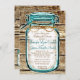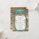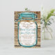 Rustic Country Mason Jar Rehearsal Dinner Invitations with a teal blue accent on a printed barn wood background for a rustic wedding theme.