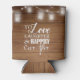 This rustic custom wedding can cooler features the phrase "To love, laughter, and happily ever after" on a distressed barn wood background bordered with glowing mason jars and string lights. Customise the other side with your initials, names, and wedding date.