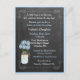 Popular chic, vintage chalkboard look, Baby shower invitation in blue. Rustic country mason jar filled with pretty blue flowers, blue and chalkboard look background print and text. Baby shower invitation is personalised. Add matching products. Please visit my store "The Hungarican Princess" at www.zazzle.com/hungaricanprincess*. Look in my "Oh Baby" department category. Congratulations! The "blue colour" hex # is BFE4FF.
