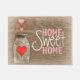 Home sweet home mason jar and heart welcome mat with a rustic wood textured background.