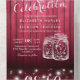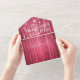Modern Wedding invitation with Detachable RSVP Postcard Template - Elegant Lettering Script and Vintage Couple Mason Jars and String Lights on Red Rustic Wood Background.