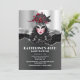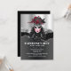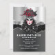 The face of a beautiful woman with pale white skin has ruby red lipstick on and a faux silver and black mask that is topped with red roses and feather plumage. She is set against a faux shiny silver and black background which has editable white templates for your custom wording. This elegant, luxurious, trendy and glam design is ideal for a bachelorette, birthday, sweet sixteen or quinceanera party. Simply personalise the editable text templates to suit your special occasion.