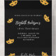 A black backround decorated with faux gold masquerade masks. Personalise and add your name, and the details. White coloured letters.