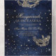A modern, chic and glamourous QUINCEAÑERA with a hand drawn gold glitter masquerade mask with rose gold glitter diamond sparkles on a dark navy blue watercolor background with rsvp all in one invitation.