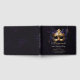 A simple, modern, elegant and chic 50th birthday party personalized guest book with a masquerade theme, featuring a gold masquerade mask with purple and gold accents, modern typography and a moody black and purple background, as well as elegant calligraphy. A lovely choice for a fiftieth birthday party in New Orleans, the Bayou or with a Mardi Gras, Nola theme, carnival, masquerade theme.