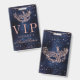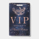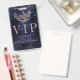 VIP passes! Give your special guests access to o your birthday, party or wedding Masquerade ball themed with this modern, chic and glamourous thank you with a hand drawn rose gold glitter masquerade mask with rose gold glitter diamond sparkles on a dark navy blue watercolor background.