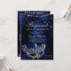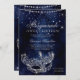 A modern, chic and glamourous sweet sixteen with a hand drawn silver glitter masquerade mask with silver glitter diamond sparkles on a dark navy blue watercolor background.