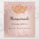For a glamourous 50th (or any age) masquerade themed birthday party. A rose gold gradient background. Decorated with faux glitter drips, paint dripping look and a golden masquerade mask. Personalise and add a name and age 50