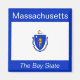 An authentic fine quality image of the flag of Massachusetts set between the state name and nickname over a flag-colour background.
