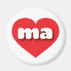 This magnet features a vibrant red heart containing the bold, white, rounded lower case letters ma, a playful abbreviation for Massachusetts, the bay state.