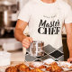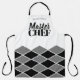 Geometric mosaic pavement style patterned print all over elegant apron in black, white and dark grey charcoal with a masculine look and bold MASTER CHEF typography script.+++++++++++ You can personalise it with your name. ++++++++ It can be a nice gift for a cooking lover or a master chef - husband, friend, fiancee, or employee.