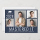 Modern masters degree dark blue graduation announcement card featuring a 4 picture photo collage, "Mastered It" written in large white letters and the grad's class year, name and school or university in simple white typography. On the reverse side, add an additional photo and a personalised message.