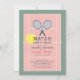 This cute and modern "Match made in heaven" bridal shower invitation features a pair of racquets, a ball on a tennis court background in pink and green. The reverse side features a green background with white polka dots. Personalise for your needs. You can find more matching products at my store.