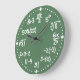This fun and whimsical custom wall clock is perfect for math lovers. Test your arithmetic! The clock has mathematical equations instead of numbers. There is some addition, subtraction, multiplication, division, percentages, fractions, algebra, square root, and powers. This second version of the clock also has a factorial and cube root. They look like white chalk written on a green chalkboard.