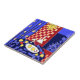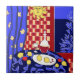 Modern and decorative digital artwork in expressive and bold colours representing a night scene with the Moon seen from a window of an interior with a table covered with blue cloth with botanical pattern, blue curtains with floral pattern, red chequered wall with a sun ornament. A plate with some lemons, grapes and apples scattered on the table, a bottle and a glass of red wine. This genuine artwork by Tanjica is greatly inspired by Henri Matisse and is not a copy of any of his masterpieces.