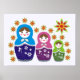 Matryoshka Russian dolls & sunflowers custom design featuring colourful Matryoshka or Matroska Russian folk art dolls in blue, green and pink purple with flowers and around them sunflowers.