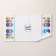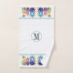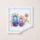 Matryoshka Russian dolls and sunflowers custom design featuring a colourful pattern of Matryoshka or Matroska Russian folk art dolls in blue, green and pink purple with flowers and around them sunflowers. The hand towel includes borders of the dolls with double blue lines and your monogram while the washcloth has a doll in the centre with a blur border arounr.