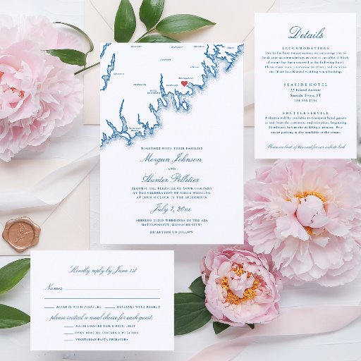 Celebrate your South Coast wedding with this elegant navy blue Mattapoisett, MA map invitation. Showcasing refined coastal New England style and timeless nautical charm, it’s perfect for a waterfront ceremony or seaside reception. Ideal for weddings at The Inn on Shipyard Park, Mattapoisett Boatyard, Bay Club at Mattapoisett, and Shining Tides Weddings By the Sea, this sophisticated design beautifully sets the tone for your harbor celebration. Artwork by Coastal Map Designs.
