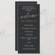 A matte black birthday party program with elegant fonts and a delicate calligraphy script writing welcome across the top of the program. Add your program, the date, and the name of the person celebrating their birthday. Clean, simple, timeless, and elegant.