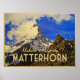 A deeply dramatic mountain scene as the snowy peaks of the Matterhorn in the Alps break through the clouds and a deep blue sky between Italy and Switzerland.