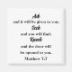 This elegant Bible verse magnet shows a favourite Scripture passage of Matthew 7:7, the familiar "ask seek knock" Bible verse. It is elegantly written in two fonts that are easy to customise in the Design Tool in the Edit This button on page. It's easy to personalise by changing the fonts, colour, or background colour to make it uniquely yours. "Ask and it will be given to you; seek and you will find; knock and the door will be opened to you."