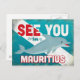 See You In Mauritius retro dolphin travel design. Charming turquoise vintage style with a cheerful swimming dolphin.