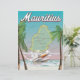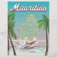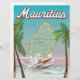Illustrated map of Mauritius in a beautiful vintage or retro style, featuring a sea plane landing on a beautiful beach.