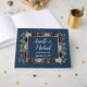 Mauve and Navy Blue Gold Plum Wedding Guest Book - feature greenery (eucalyptus) over a navy blue watercolor background with floral elements in shades of purple, plum, mauve, dusty rose and deep burgundy.