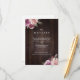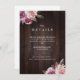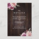 Watercolor botanical floral design in mauve purple, mulberry, dusty rose and peach colour on dark barn wood grain background, with modern script and text, elegant and stylish, great wedding details cards for rustic botanical garden wedding in fall and winter.