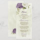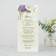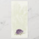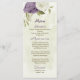 Beautiful romantic wedding menu card featuring mauve and white flowers and some pretty green leaves .