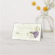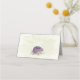 Beautiful romantic wedding place card featuring mauve and white flowers and some pretty green leaves .