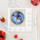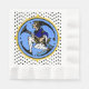 Stylish Hanukkah Napkin features IconDoIt's original variation on a pre-WWI era Maxfield Parrish elf character w/ polka dot leggings, a menorah on his shoe, on a periwinkle circle, coordinating dreidels & black polka dots on white backdrop. Customisable greeting on back.