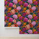 This bold floral pattern features dramatic purple, peach, and mustard yellow flowers on a dark pink background.