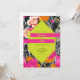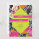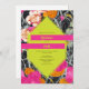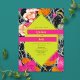 Neon yellow 6 sided geometric shape over pink orange and peach modern floral with dark marbleised design. Names are neon yellow on hot pink bars.
