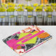 Neon yellow diamond shape over pink orange and peach modern floral with dark marbleised design. Names in neon yellow over hot pink bars. Remaining text is black.