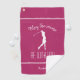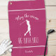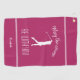 This cute and modern golf towel features the quote “May the Course Be With You!” with a lady golfer silhouette in white on a chic pink background with double white accent borders. A customisable template allows you to add a name, initials, or short line of text.