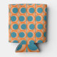 This can cooler has a mid-century modern design of open orange circles with solid teal circles running across the pattern with teal vertical lines and orange horizontal lines.