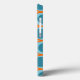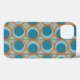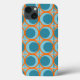 This phone case has a mid-century modern design of open orange circles with solid teal circles running across the pattern with teal vertical lines and orange horizontal lines on a field of teal.